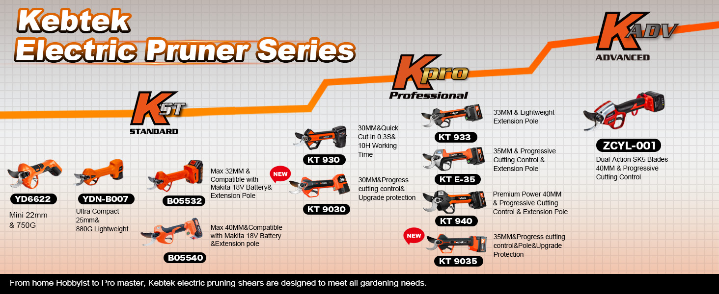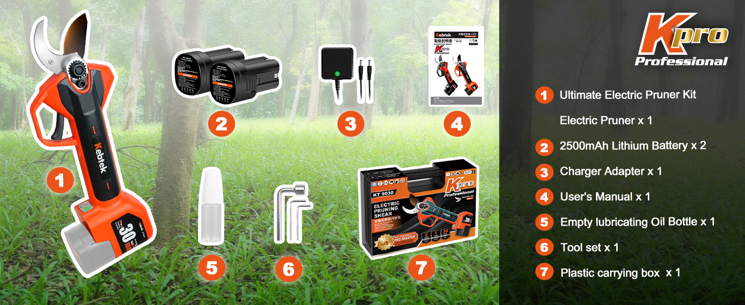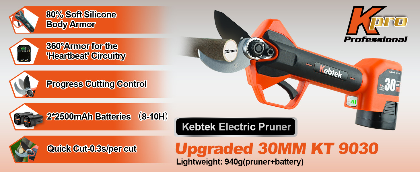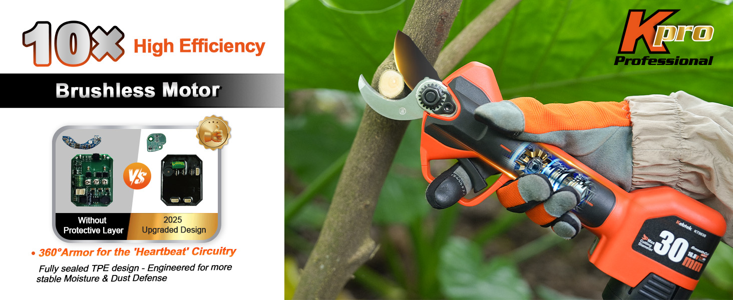 【Upgraded Model】 2025 NEW KT9030 electric pruning shears new debut! The motherboard adopts a double-layer encapsulation process, dust and moisture resistance to enhance the ability of 15%, the risk of circuit failure to reduce 70%; handle overlay anti-slip encapsulation, comfortable grip, not tired of holding for a long time; the key parts of the body plus anti-collision encapsulation, impact resistance to enhance the performance of 50%, reduce the fall and collision damage.