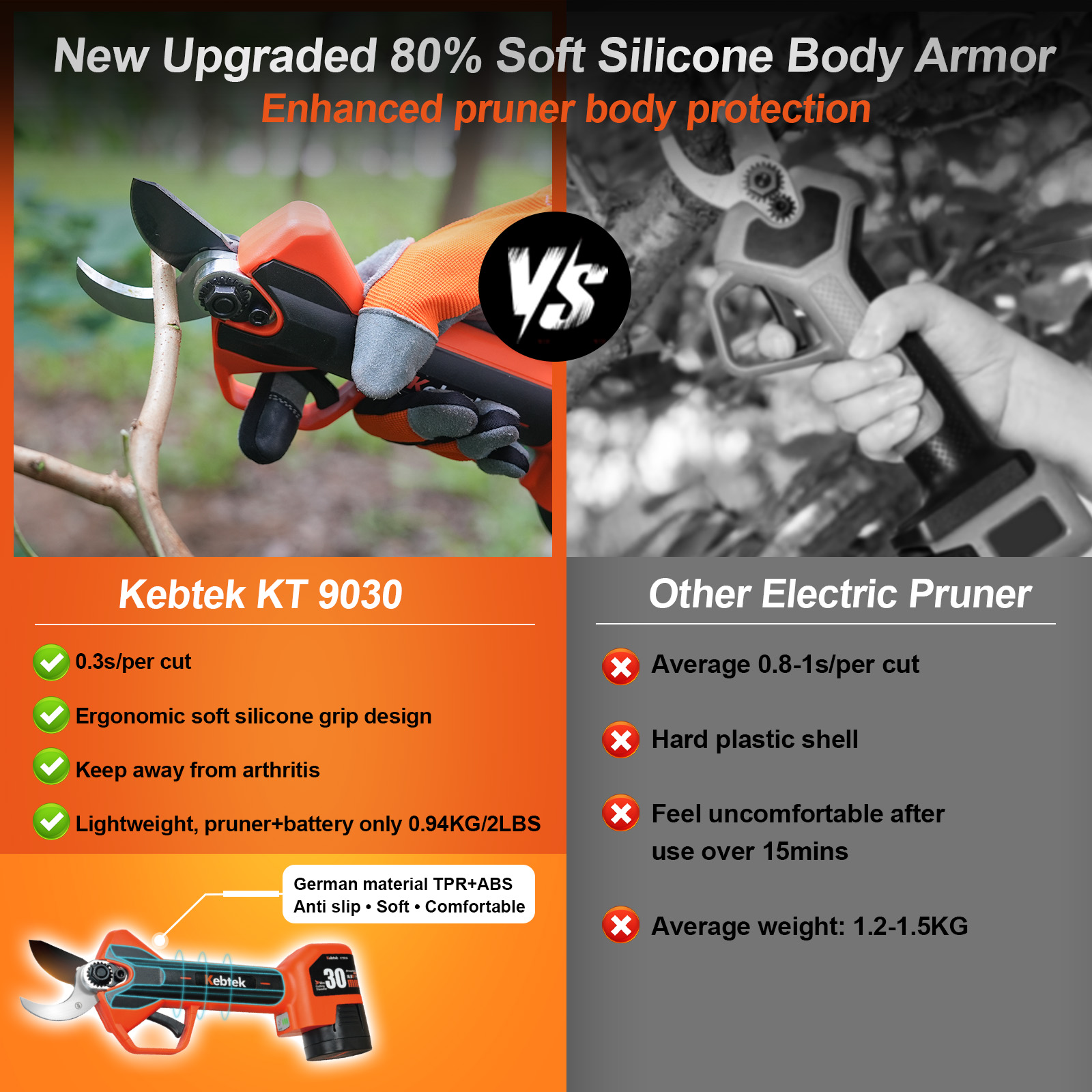 【Upgraded Model】 2025 NEW KT9030 electric pruning shears new debut! The motherboard adopts a double-layer encapsulation process, dust and moisture resistance to enhance the ability of 15%, the risk of circuit failure to reduce 70%; handle overlay anti-slip encapsulation, comfortable grip, not tired of holding for a long time; the key parts of the body plus anti-collision encapsulation, impact resistance to enhance the performance of 50%, reduce the fall and collision damage.